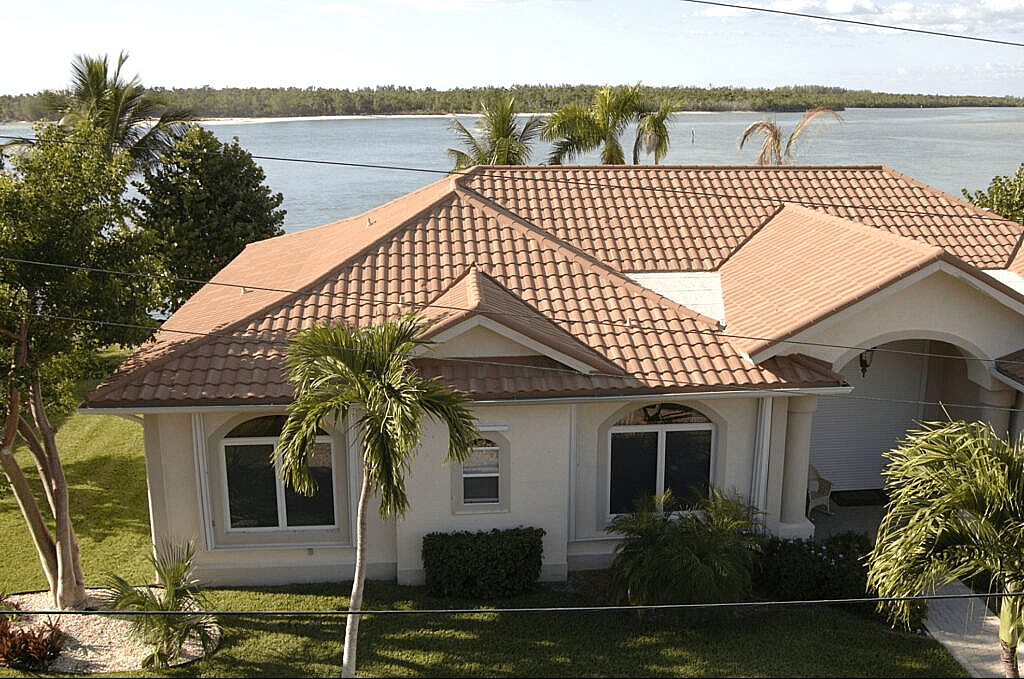 A close-up view of a house roof with reddish-brown clay tiles under a clear sky.